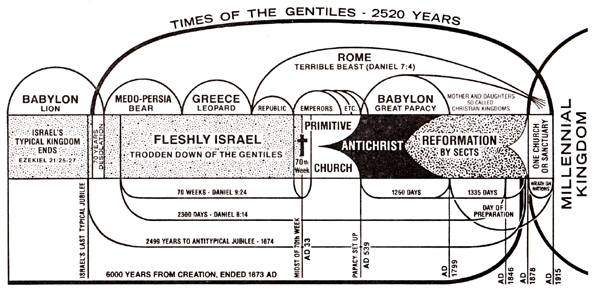 The focus of time prophecy upon the harvest and matters connected with the Lord's presence and the establishment of the Kingdom, will be impressed upon the mind by a careful study of the accompanying diagrams, one of which shows the parallels or correspondencies between the Gospel age and its type, the Jewish age, and how the various prominent features in this harvest are marked by the great prophecies, while the other concisely shows the history of the world as related to that of God's typical and real churches (Jewish and Gospel), and points out the prophetic measures relating to them.